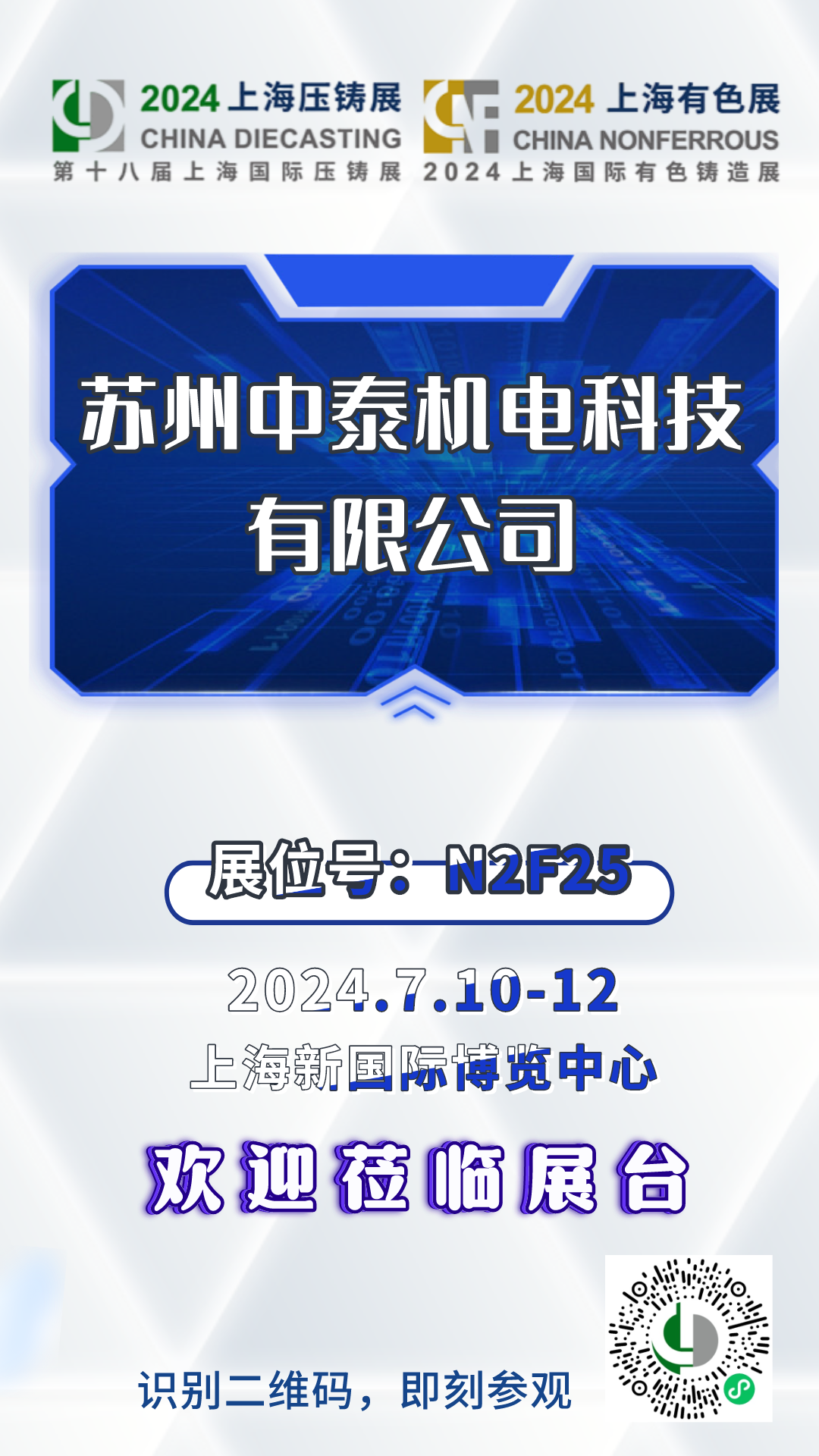 2024年7月10日 – 12日,第十八屆上海國際壓鑄暨有色鑄造展將在上海新國際博覽中心盛大開展,歡迎各位蒞臨蘇州中泰機電科技有限公司展臺參觀指導(dǎo)!