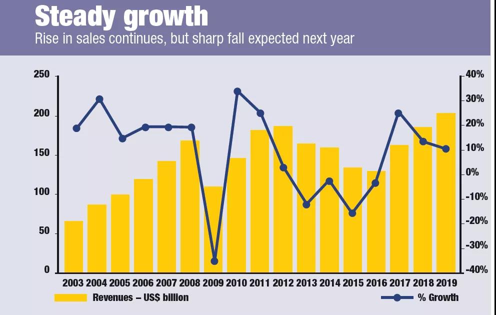 盡管2019年的數(shù)字創(chuàng)歷史新高,但值得強調(diào)的是,增速正在放緩?!禮ellow Table》顯示2017年與2016年相比增長了25.5%,2018年的增長率為13.5%。受新冠肺炎疫情影響,明年全球銷量將大幅下降。