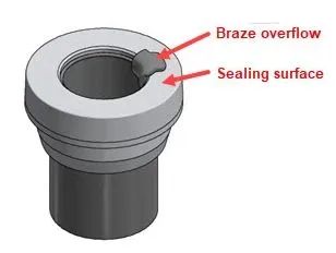 釬焊是一項(xiàng)復(fù)雜的操作,可能會導(dǎo)致密封面上出現(xiàn)焊渣溢流。由于密封面被破壞,就可能造成鋼管螺母處的泄漏。焊條熔化時(shí)產(chǎn)生的熱量使密封面位置可能產(chǎn)生焊渣溢流,焊條融化液會流向更高溫度的地方。一旦發(fā)生融化液溢流,應(yīng)立即轉(zhuǎn)移到襯套的小直徑端進(jìn)行焊接,使融化液均勻流過接頭。如果發(fā)現(xiàn)釬焊溢流,裝配前請取下受影響的襯套,然后在該位置處重新釬焊一個(gè)新的襯套。