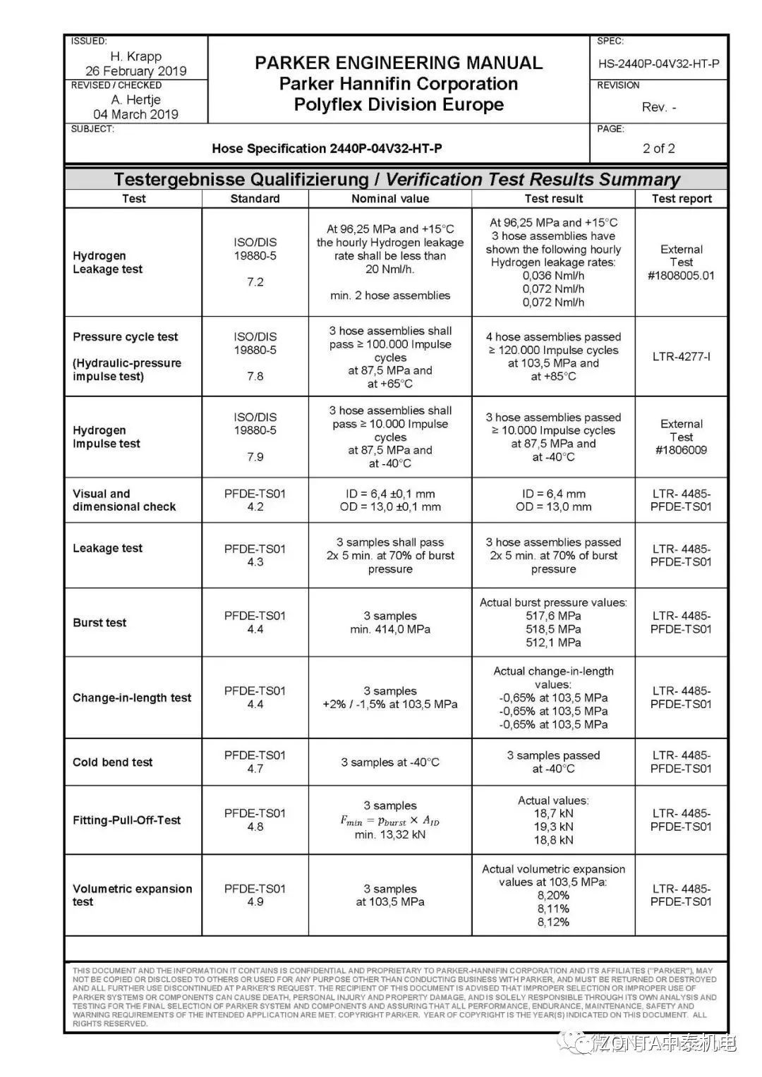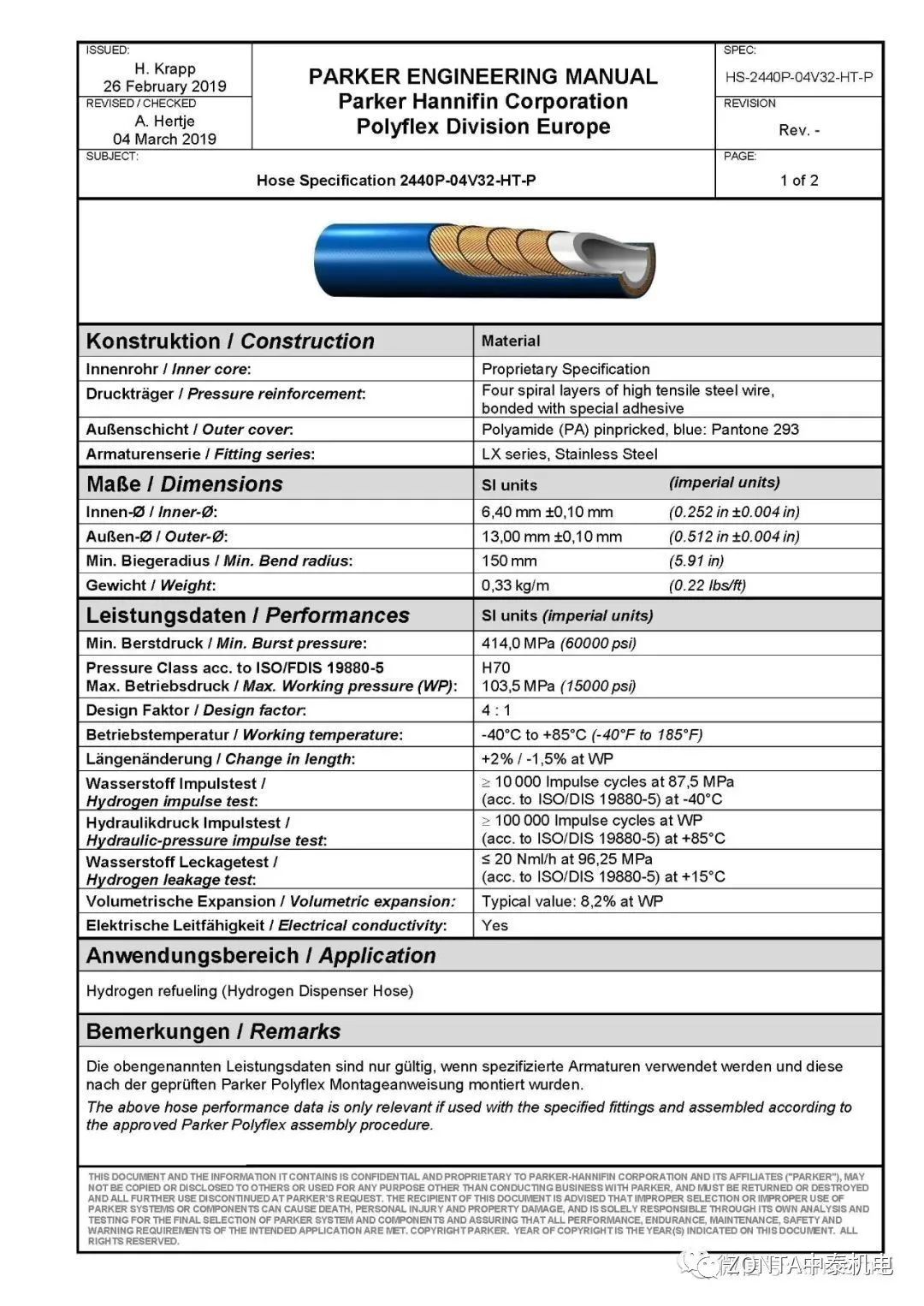 派克2440P-04V32-HT-P氫氣軟管工作壓力高達(dá)875bar,符合ISO-19880-5 要求,可在-40℃的低溫環(huán)境下實(shí)現(xiàn)快速加氫。該軟管具有很高的耐磨性、很好的耐臭氧能力、很強(qiáng)的抗紫外線能力、壽命周期長(zhǎng),適合于戶外安裝應(yīng)用。另外其小彎曲半徑的特點(diǎn)使其可應(yīng)用于狹小的安裝空間。最后,該軟管不但能有效降低氫氣滲透,還能顯著提升氫氣系統(tǒng)運(yùn)行的安全,是氫能源系統(tǒng)的理想選擇。